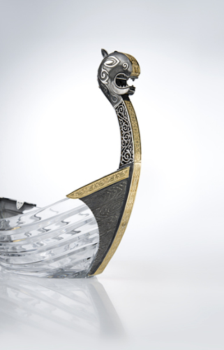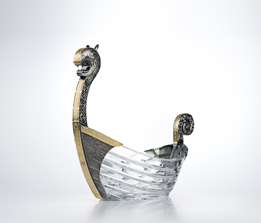 Премиальная конфетница в виде ладьи русской дружины изготовлена из хрусталя с серебром вручную. Носовая фигура ладьи выполнена в виде резной головы дракона — традиционном способе устрашения врагов. Конфетница упакована в подарочный футляр.