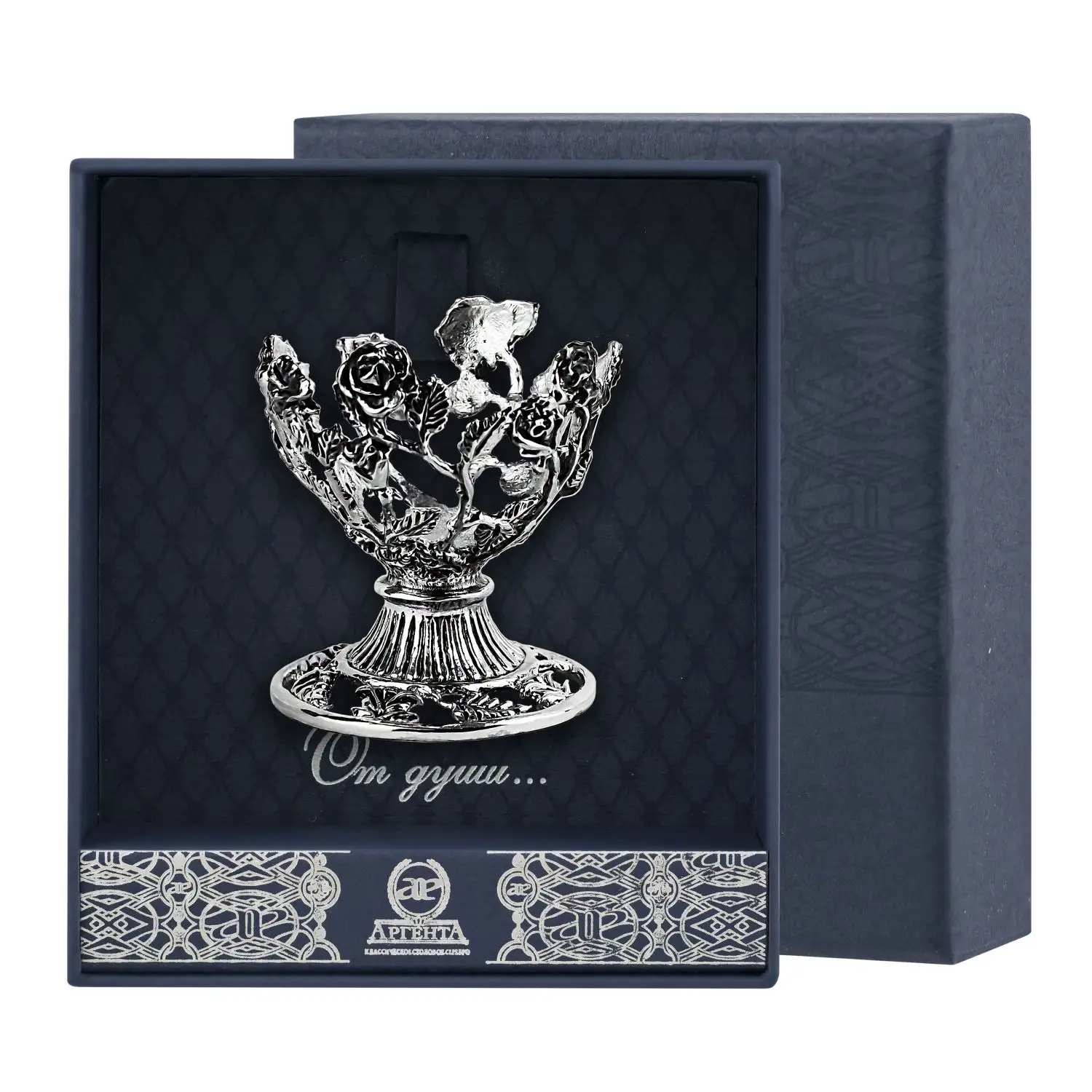 Подставка для яйца "Розалия" с чернением от бренда «Аргента». Подставка под яйцо изготовлена из серебра 925 пробы. Подставку можно использовать во время завтрака, достаточно поместить в нее яйцо и снять с него верхнюю часть скорлупы. Ёмкость точно повторяет форму куриного яйца, подходит для разных размеров и категорий. Яйцо не проваливается, а прочно удерживается в подставке. Подставка под куриное яйцо изготовлена из серебра 925 пробы. Подставка на ножке также станет отличным украшением праздничного стола, независимо от того, гости собрались на Пасху, Новый Год, День Рождения или другой праздник. Подставка для яйца упакована в фирменный футляр и станет готовым подарком для женщин и детей, друзей и родственников, а также коллег.