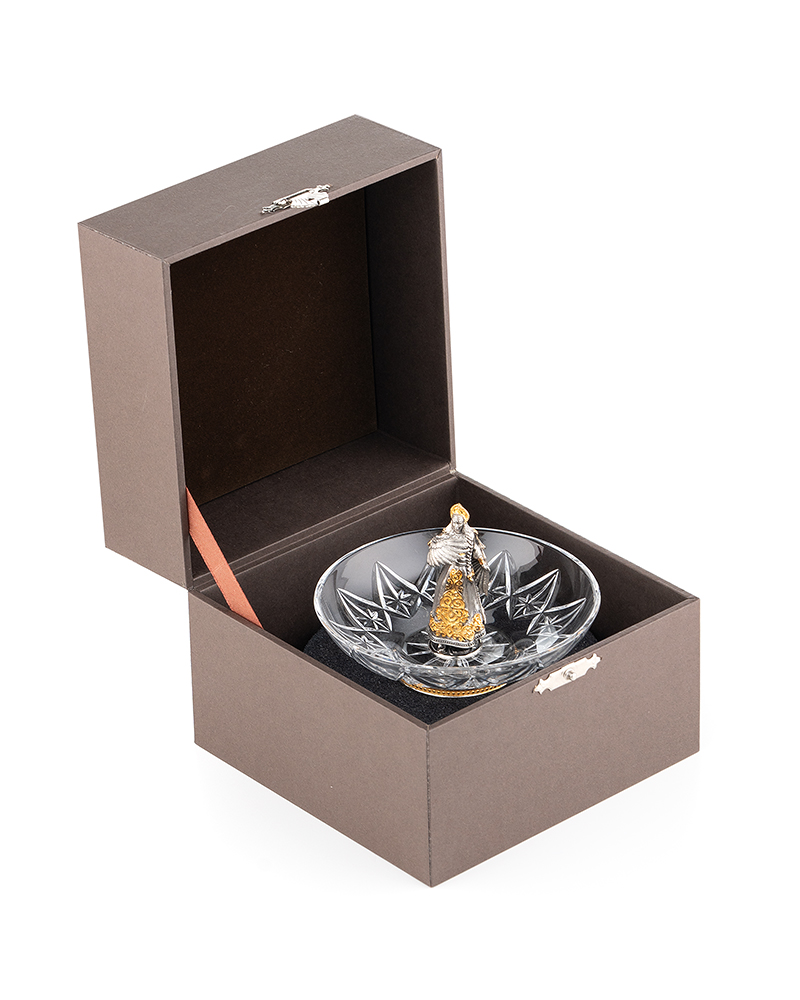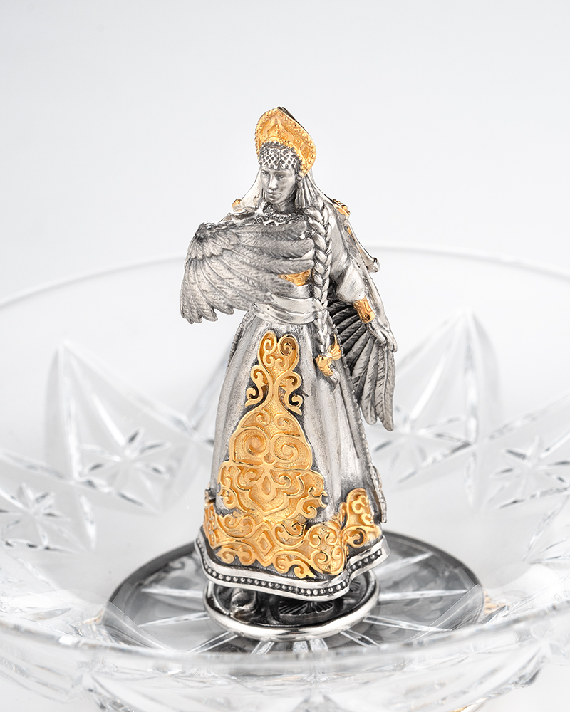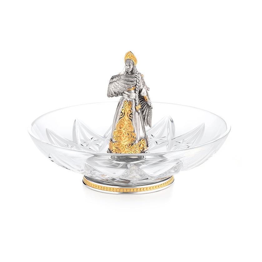 Хрустальная с серебром, сказочная тарелочка, сделана полностью вручную. Удобный держатель блюдца изготовлен в виде фигуры Царевны-Лебедь. Фирменный подарочный футляр в комплекте.