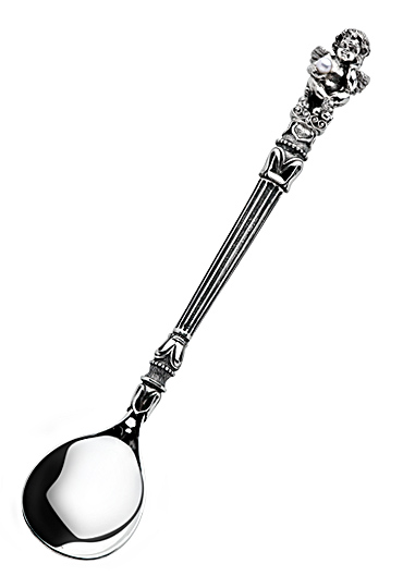 Серебряная ложка выполнялась в греческом стиле, поэтому черенок получил форму античной колонны, расширяющейся от основания к капители с вертикальными полированными ребрами. Ордер колонны напоминает собранные в бутон полураскрытые лепестки лилии, чередующиеся с матовыми фрагментами, обработанными точечной насечкой. Основание и капитель колонны опоясаны двумя нитками серебряных шариков, напоминающих жемчужное ожерелье. Классическая капитель в виде двух сложенных свитков поддерживает фигурку ангела, сидящего на облаке. В ладони у ангела жемчужина как символ чистоты и совершенства. Жемчуг обладает магическими и целебными свойствами. Это символ любви, изобилия и плодородия, самая большая драгоценность, даруемая морем. У японцев жемчуг — священный камень. Они говорят — подарить жемчужину, значит признаться в любви. Когда рождается ребенок – ему дарят жемчужину. В Европе жемчуг дарят на тридцатилетнюю годовщину свадьбы, которая так и называется «жемчужной». Старинное название жемчуга – перл – вошло в поэтический язык, как определение всего удивительного, превосходного.