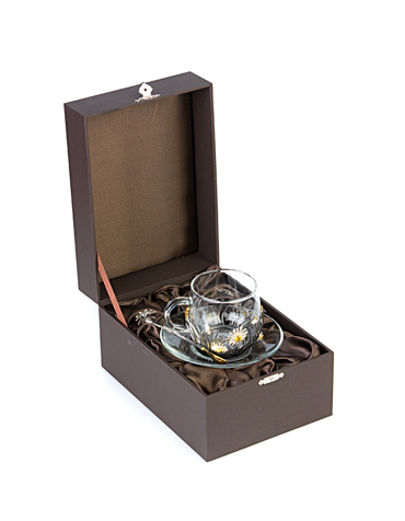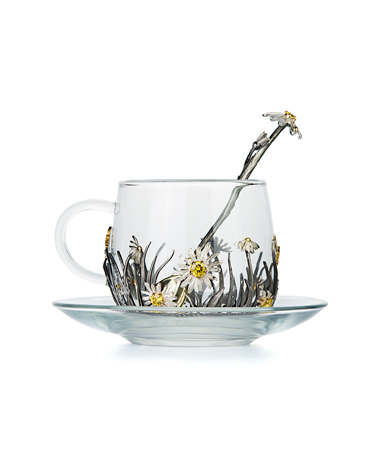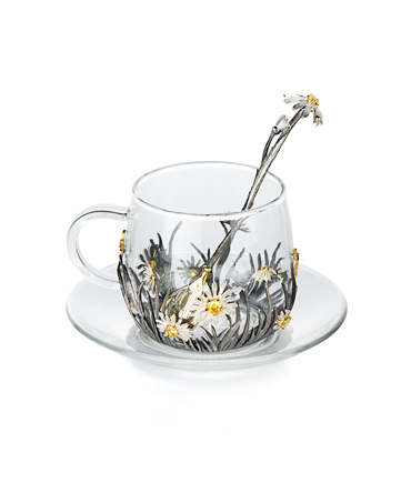 Чашка «Ромашка» выполнена из термостойкого стекла украшенного серебром.
