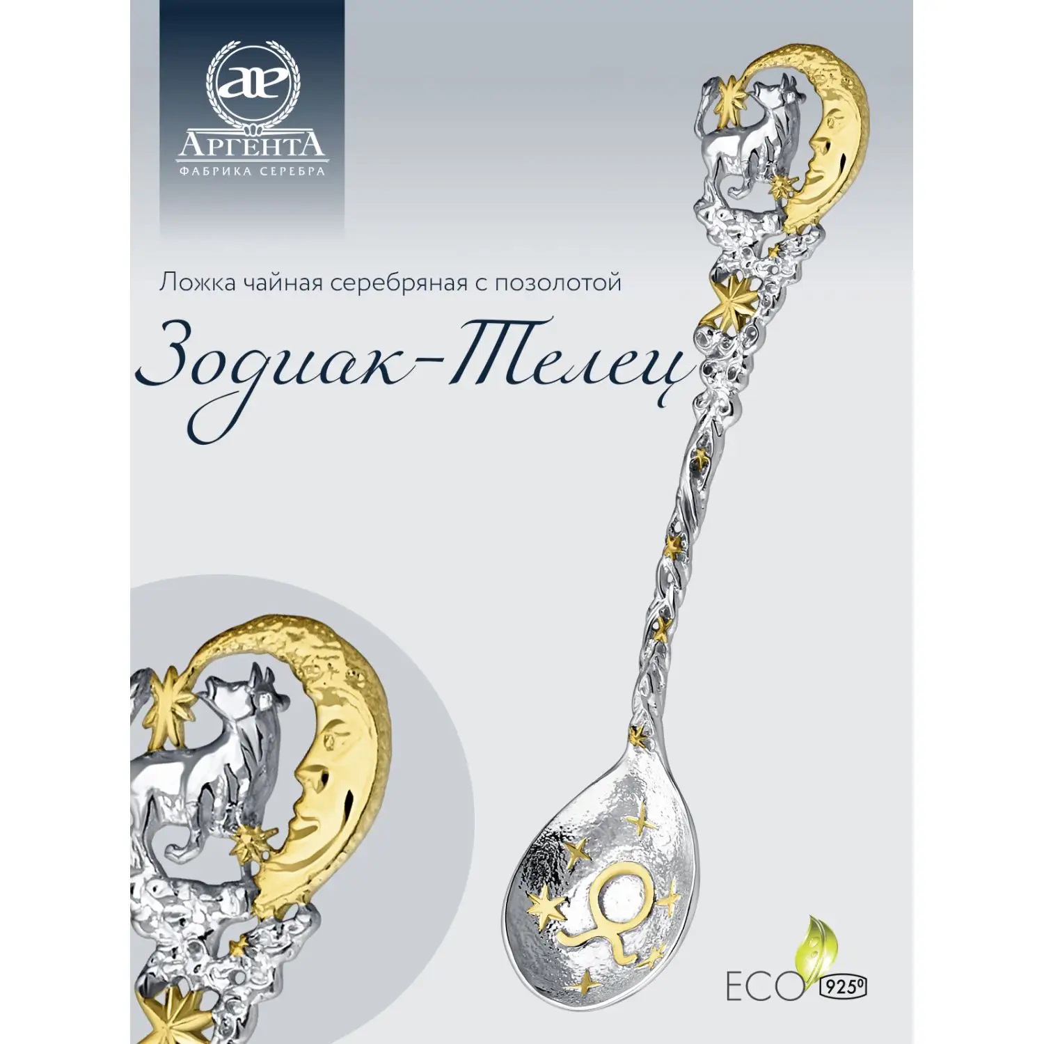 Чайная ложка из серебра "Зодиак-Телец" с позолотой. Длина – 13.2 см., ширина - 3 см. Артикул: CLS0058