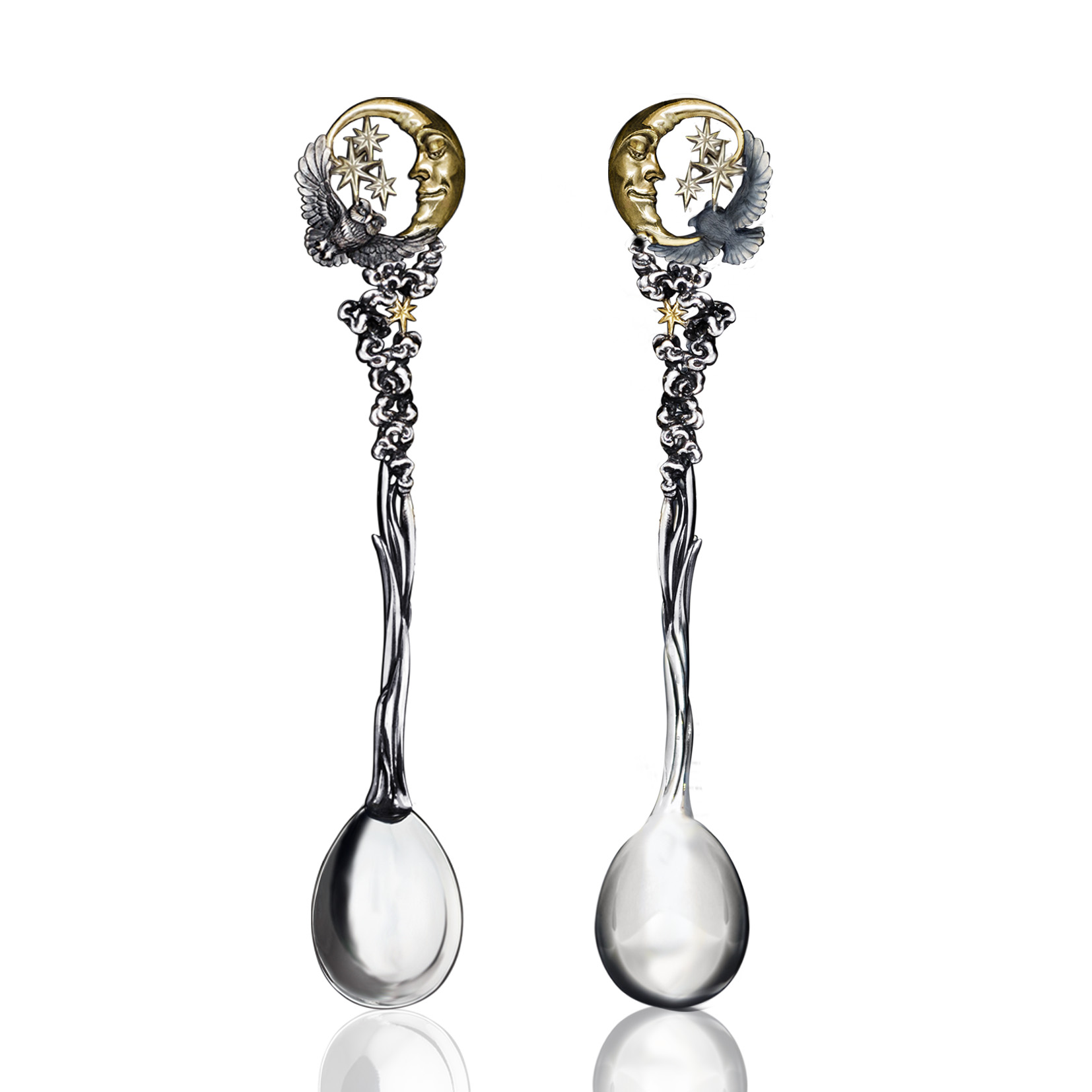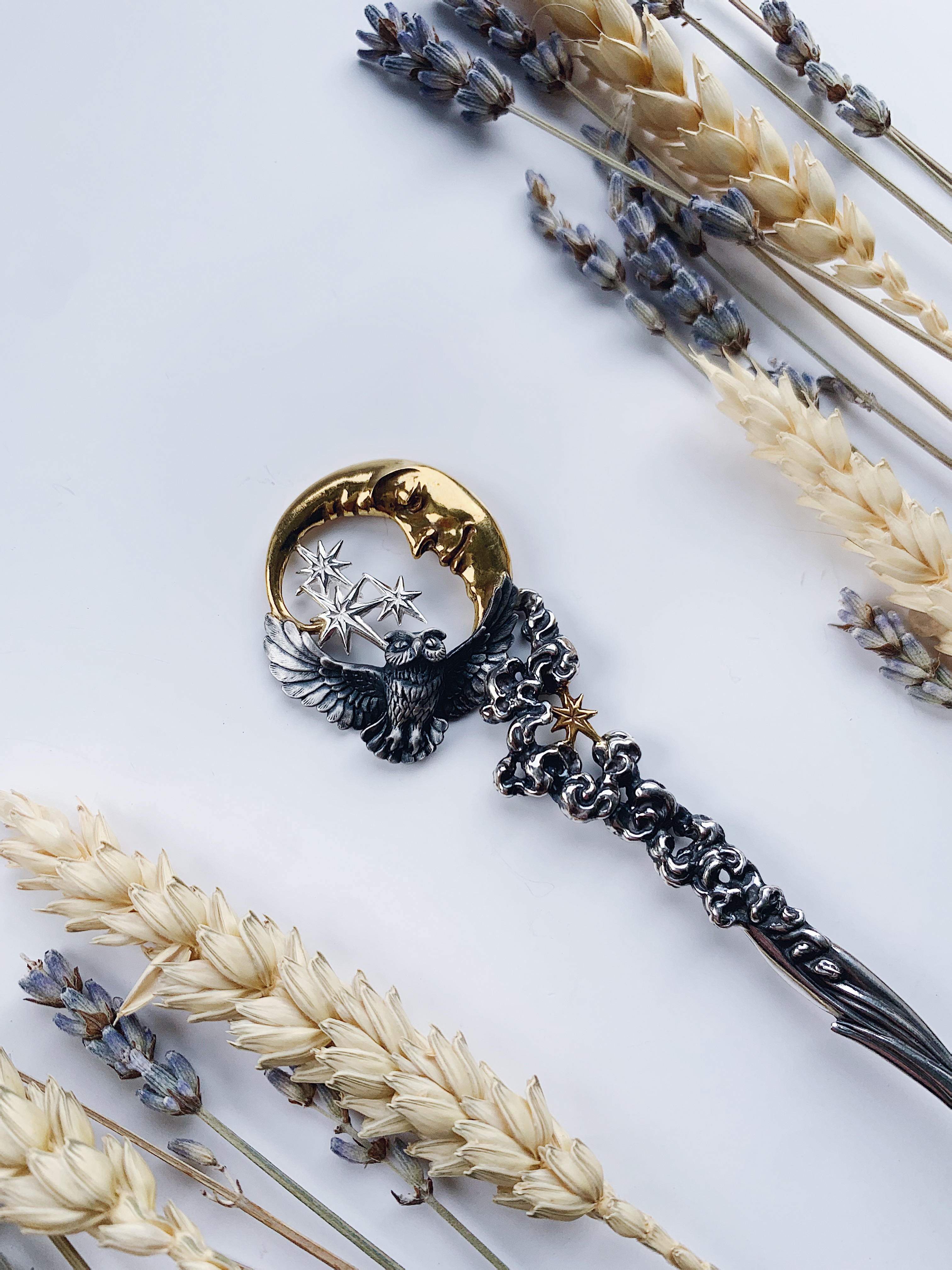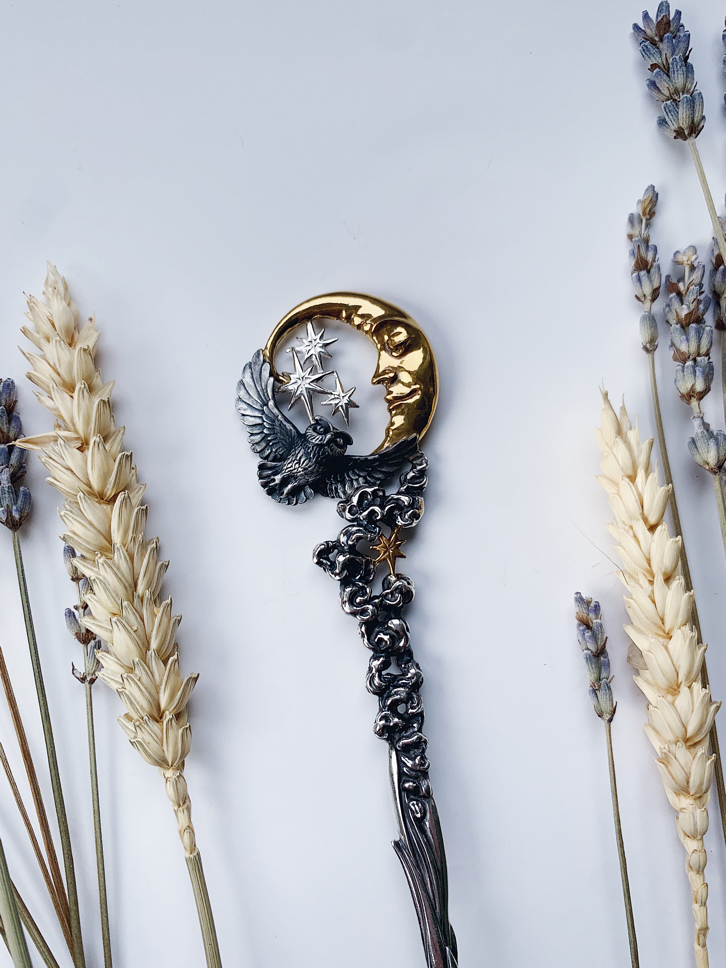 Ложка "Ночь" изображает символ ночи — мудрую черную сову, летящую к звездам на свет молодого месяца.