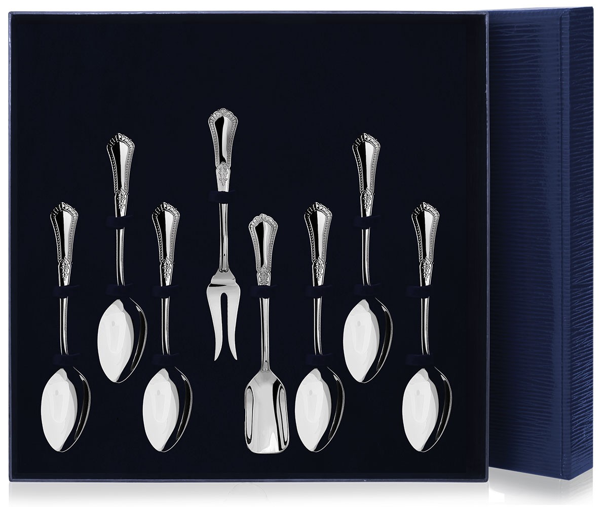 Серебряный набор для десерта "Фаворит" №2 отличается великолепными узорами по контуру каждого из предметов. Внутри футляра находятся чайные ложки, элегантный совочек для сахара и вилочка для накалывания лайма или лимона. Приборы выполнены из серебра 925 пробы. Станет превосходным подарком на любые праздники. Идеально подходит для сервировки десертов на любом столе.