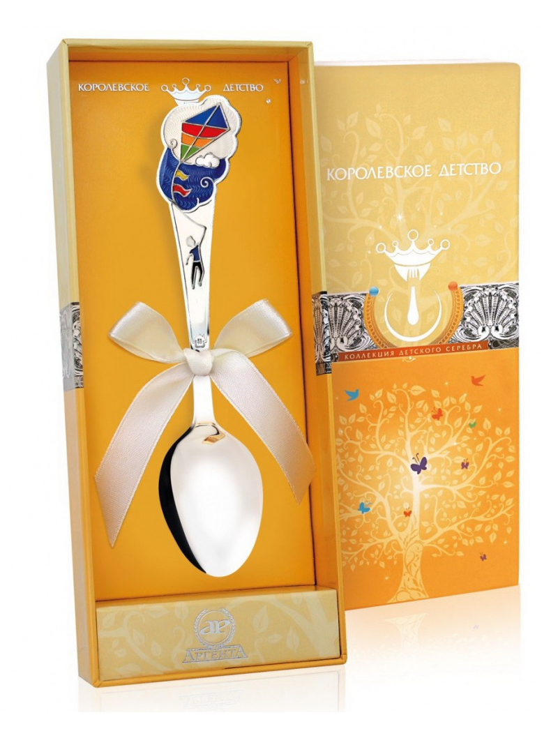 Серебряная ложка детская "Авиатор" с эмалью - изящное и яркое изделие, пользоваться которой только в радость. На рукоятке изображен малыш, запускающий в небо воздушного змея, раскрашенного насыщенными красками: синими, красными, желтыми и зелёными. Композиция словно срисована с детского сна и также символизирует особенный детский внутренний мир, полный ярких цветов и безграничных фантазий. Ложка изготовлена из качественного серебра 925 пробы и прослужит долгие годы. Изделие входит в коллекцию "Королевское детство". Упаковкой ложки служит желтый футляр из картона.