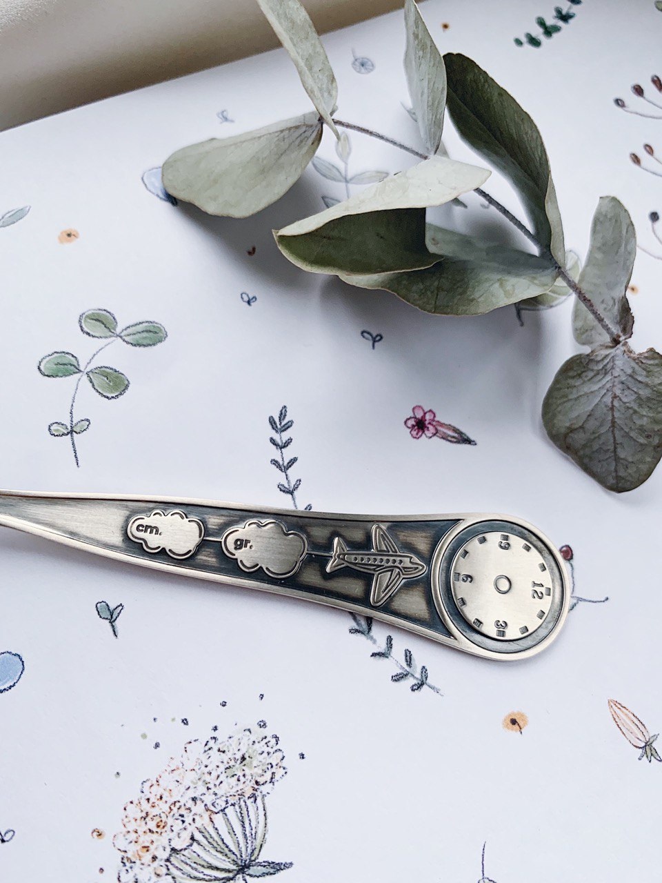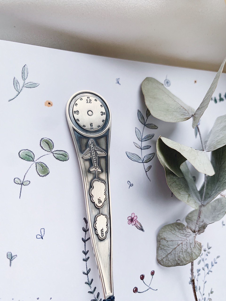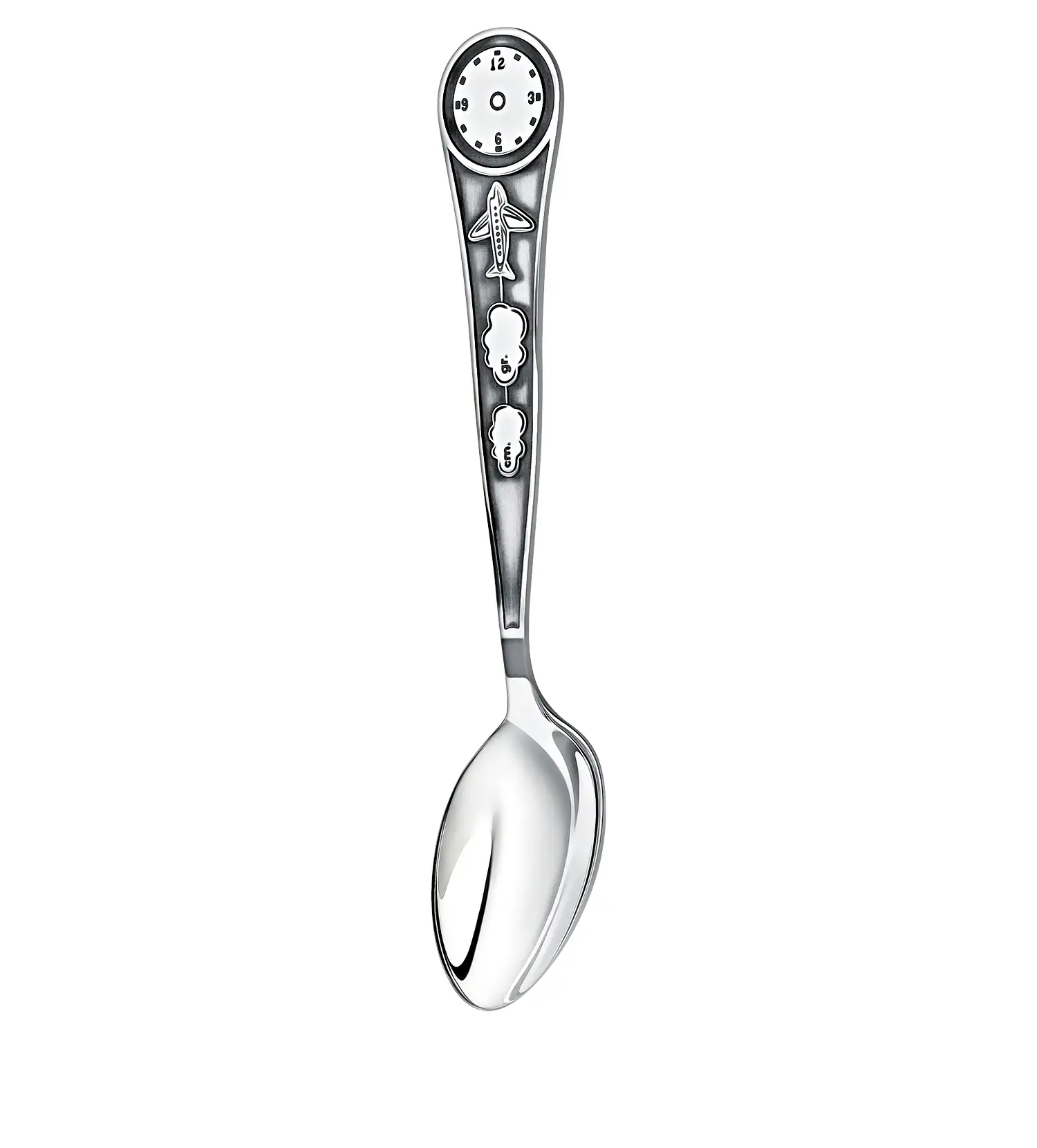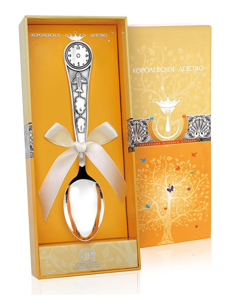 Серебряная ложка детская "Часы" с чернением отличается интересной задумкой, которая позволит вам выгравировать не только имя малыша, но и стрелки на циферблате, показывающие время рождения ребёнка. На рукоятке изображены несколько рисунков - часы и самолет, к которому привязаны два облака. Такое украшение придает изделию необычный вид, ребенок будет рассматривать рисунки и с интересом отнесется к кормлению. Ложка изготовлена из серебра 925 пробы и покрыта чернением, упакована в жёлтый подарочный футляр.