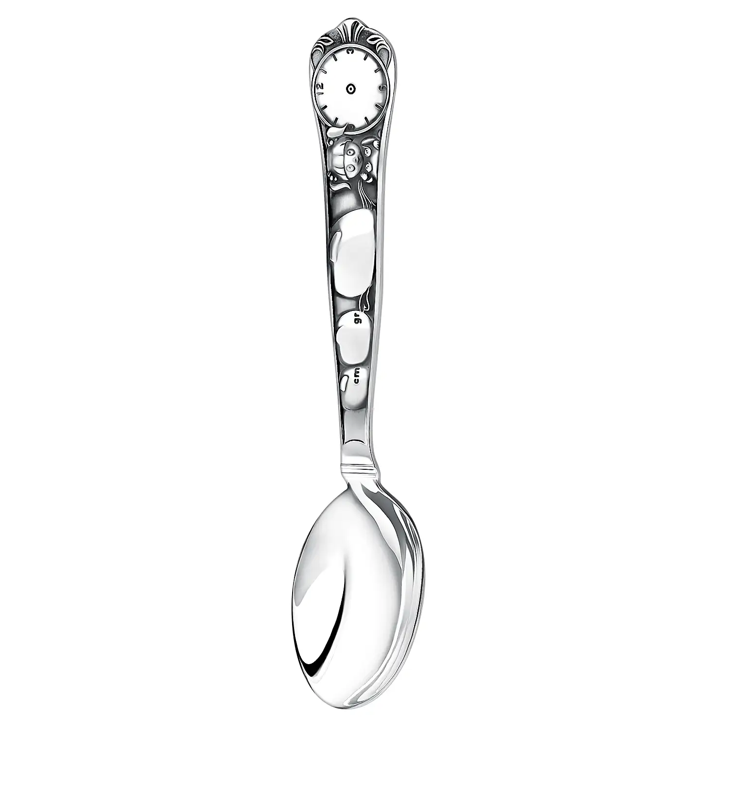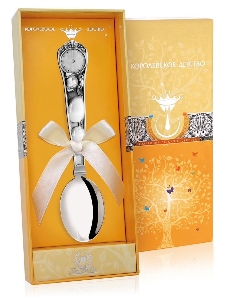 Серебряная ложка детская "Кукла" - это удивительной красоты изделие, украшенное изображением циферблата и маленькой куколки с двумя хвостиками. Украшение придает ложке игривость и нежность. Интересная задумка в дизайне серебряной ложки "Кукла" позволит вам выгравировать не только имя малышки, но и стрелки на циферблате, показывающие время рождения ребёнка. Ложка изготовлена из серебра пробы 925 и для торжественности упакована в жёлтый подарочный футляр. Изделие входит в коллекцию "Королевское детство".