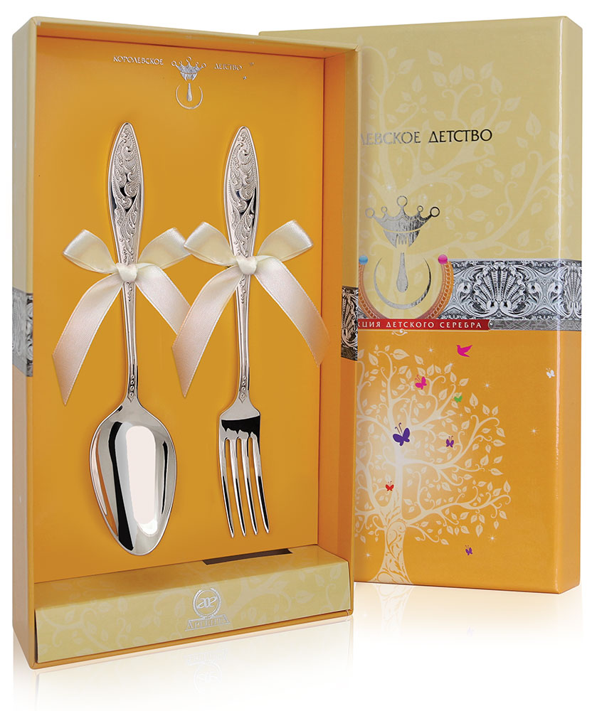 Серебряный набор десертный "Морозко" - это 2 предмета столового серебра: десертные вилка и ложка. Рукоятка украшена волшебными узорами, напоминающие иней, покрывающий зимой окна домов узорами причудливых форм. Такое украшение придает изделиям особенный изыск и сказочный вид. Оба предмета выполнены из серебра пробы 925. Представленный комплект может положить началом в коллекции столовых приборов ребенка. Вилка и ложка упакованы в яркий желтый футляр серии "Королевское детство". Десертный набор "Морозко" - это великолепный подарок для ребенка по случаю дня рождения, крещения, первого зуба и других важных дней в его жизни.