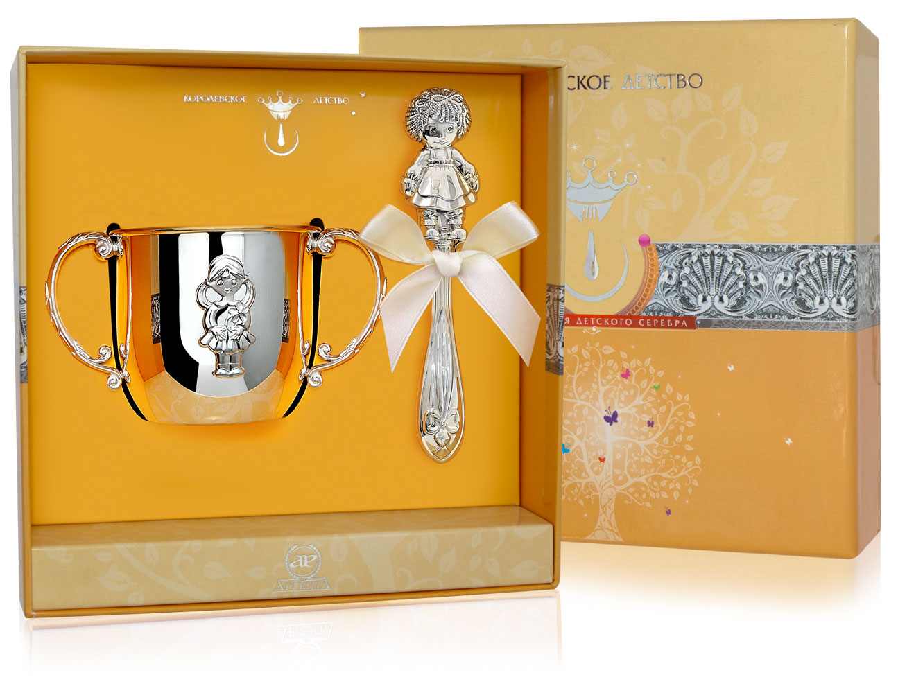 Серебряный набор "Девочка" поильник и погремушка изготовлен из серебра 925 пробы, продаётся в подарочной коробке жёлтого цвета, удобной как для транспортировки, так и для вручения подарка. Тонкие изящные ручки поильника помогут малышке удобно держать предмет, а фигурка девочки на боковой поверхности будет привлекать внимание и вызывать улыбку. Верх погремушки также выполнен в виде фигурки девочки. Если ребёнок возьмёт погремушку в рот, она не причинит ему вреда, так как серебро обладает антисептическими свойствами, а фигурка выполнена качественно и без острых частей. Серебряный набор "Девочка" прекрасно подходит для подарка по любому поводу, связанному с рождением и взрослением малышки. Выбрав его, вы покажете себя внимательным и добрым родным, близким или коллегой.