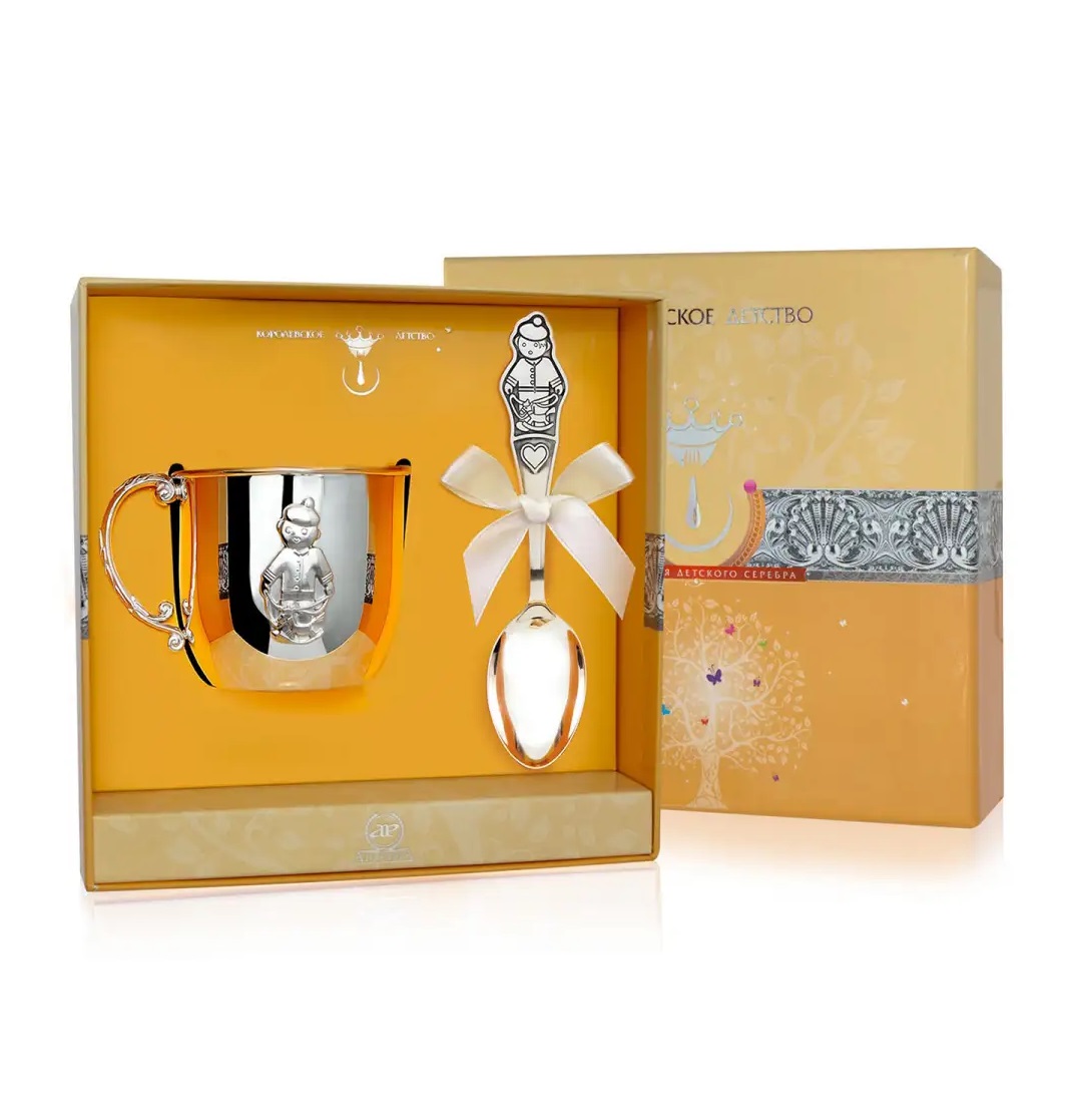Коллекция КОРОЛЕВСКОЕ ДЕТСТВО - одна из самых широких и известных коллекций детского серебра в России. Она содержит множество очаровательных моделей серебряных ложек, вилок и ножей, погремушек и пустышек, поильников и кружек. Все детские серебряные приборы проходят строгий контроль качества. Экологическое серебро, произведённое непосредственно на фабрике, тщательная ручная полировка хлопковыми валиками делает изделия абсолютно безопасными для ребёнка. Благодаря дезинфицирующей функции серебра, регулярное использование серебряных приборов может поддержать естественный иммунитет организма и даже предотвратить некоторые из типичных детских болезней. Специалисты фабрики получили грант на применение сложной, но очень красивой техники гильоширования, которой пользовался известный Карл Фаберже. Это позволило создавать удивительно яркие и объемные изображения на изделиях. Коллекция полна милыми персонажами, которые станут для ребёнка верными друзьями.