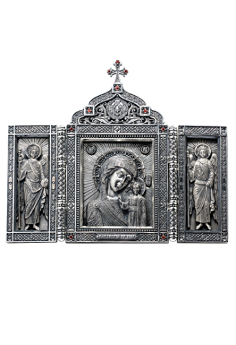 Серебряный складень "Казанская Богоматерь" - 1 шт. Длина - 12,8 см., ширина - 10,7 см., высота - 7,5 см. Артикул: SSK0001