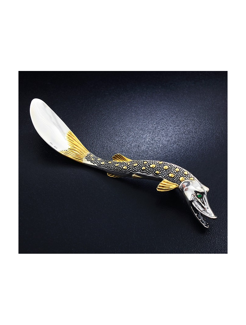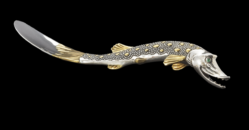 Икорница из серебра "Емеля" с серебряной лопаточкой "Щука". Высота - 11.4 см., длина - 15.2 см., ширина - 10.5 см. Артикул: IIS0014