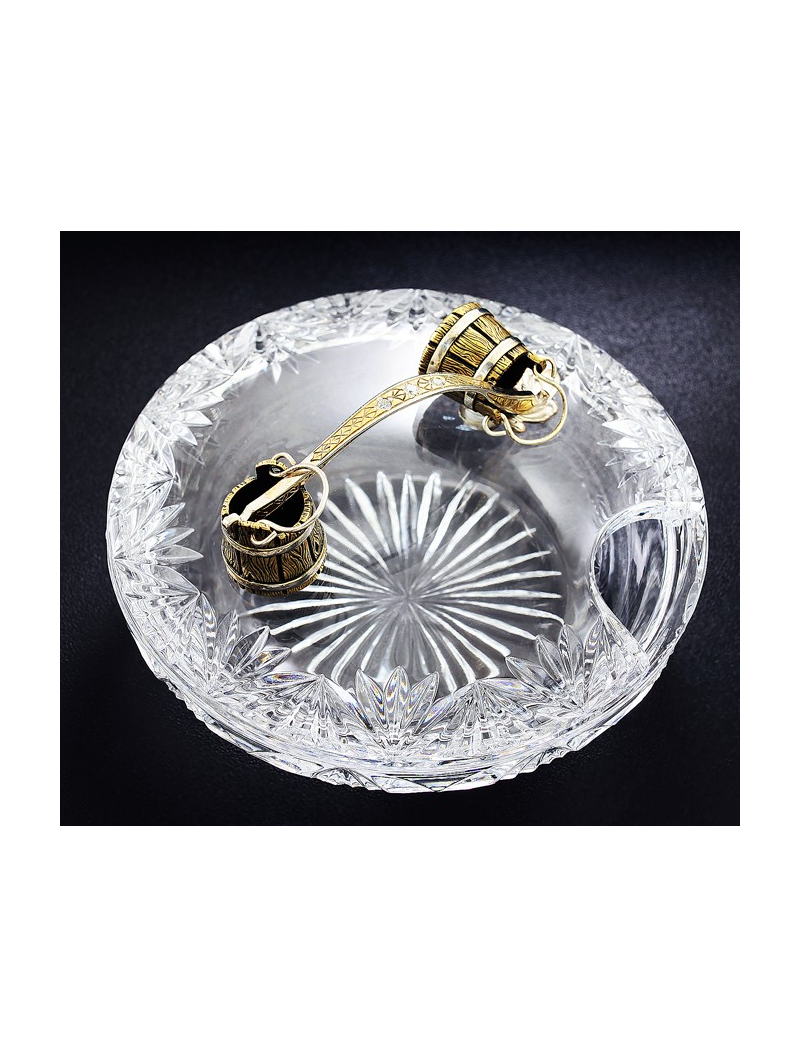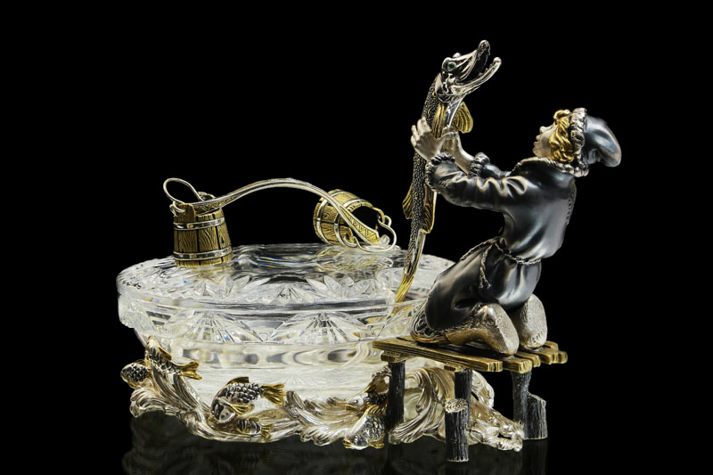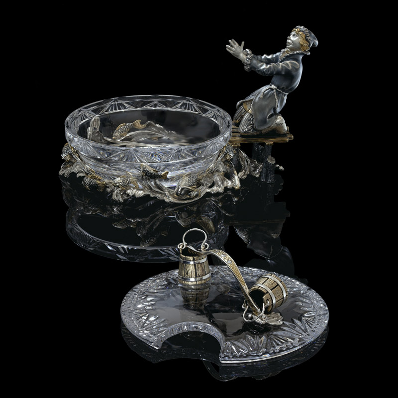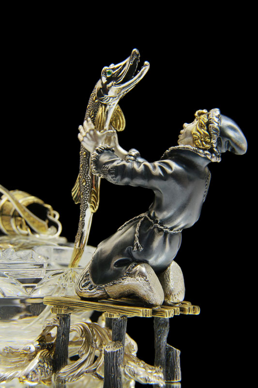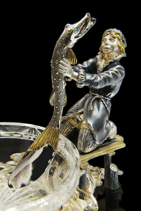 Представленная коллекция представляет собой икорницу с лопаточкой - композицию из Емели, поймавшего своими руками щуку. Хрустальная гладь замерзшей проруби с плавающими подо льдом рыбками оживляет композицию. Мы видим изумленное лицо Емели, в первый раз поймавшего говорящую рыбу. Изящно выполнена лопатка для икры — щука с очаровательными изумрудными глазами. Оригинально задумана сама конструкция икорницы, где функциональность сочетается с самим сюжетом сказки. Созданные образы сказочных героев помогут создать атмосферу уюта и тепла в вашем доме.