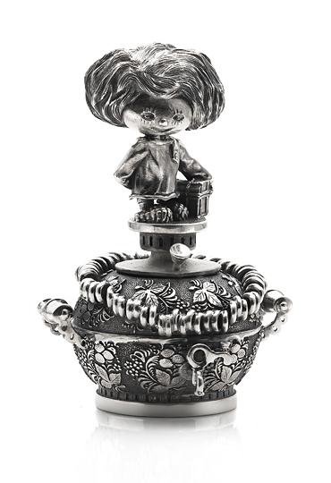 Серебряный колокольчик "Домовёнок" полностью изготовлен вручную из серебра 925 пробы с чернением. Колокольчик выполнен в форме самовара, сверху которого стоит фигурка маленького домового, очень похожего на знаменитого Кузю из мультфильма нашего детства. Изделие отличает высочайшая проработка деталей - тут и узор на самоваре, и связка баранок, и сундучок домовёнка, и его лапоточки, и шевелюра, и широко распахнутые глаза! Не удивительно, если вам захочется держать подобную вещь поближе - письменном столе или даже на прикроватной тумбочке. Колокольчик "Домовёнок" может не только порадовать вас, но и стать уникальным подарком для кого-то из ваших друзей, родных или коллег. Поставляется в подарочном футляре и доступен только по предварительному заказу.