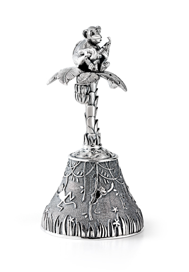 Серебряный колокольчик "Обезьянка" изготовлен вручную из серебра высшей пробы и может послужить прекрасным подарком родным, друзьям или партнёрам по бизнесу. Рукояткой колокольчика служит пальма с сидящей на ней маленькой обезьянкой. На чернёный корпус колокольчика мастера нанесли изображения обезьянок, прыгающих с лианы на лиану над растущей травой. Колокольчик "Обезьянка" радует взгляд и доставляет удовольствие мелодичным серебряным звоном.