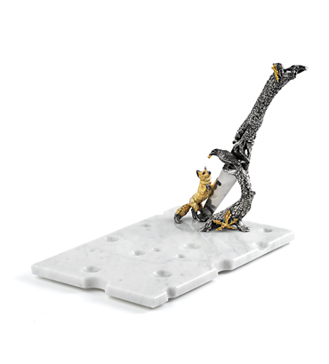 Премиальный набор для нарезки и подачи сыра по мотивам басни И. А. Крылова укомплектован специальным голландским ножом для полумягких сортов сыра. Разделочная доска выполнена из натурального мрамора, дорогого материала обладающего исключительными бактерицидными свойствами. Такая доска прочна и долговечна, легко моется и не впитывает запахи и влагу. Выложенные на мраморной доске сыры дольше остаются свежими. ( На фото представлен пилотный вариант изделия без ножа. Финальный вариант будет отличаться. Цвет и толщину мраморной подставки можно выбирать.)
