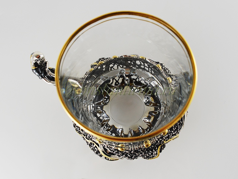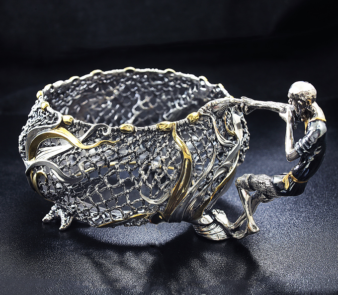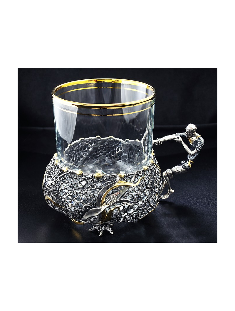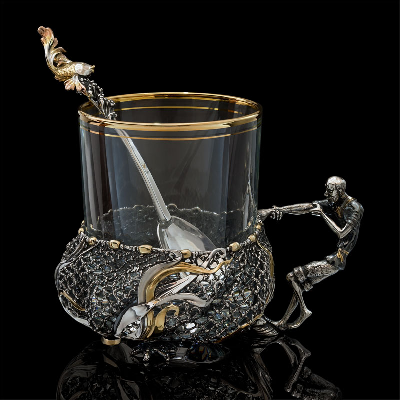Серебряный подстаканник "Старик и невод" с позолотой. Высота - 13 см., длина - 10 см., ширина - 7.2 см. Артикул: SPP0003