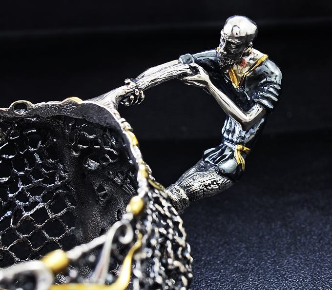 "Старуха пряла свою пряжу, старик ловил неводом рыбу..." именно "стариком с неводом" и представлен подстаканник. Сеть, оплетенная водорослями - основная его часть. Она гармонично сочетается с ручкой, выполненной в виде старика, тянущего свой невод.