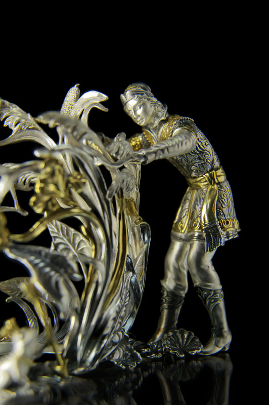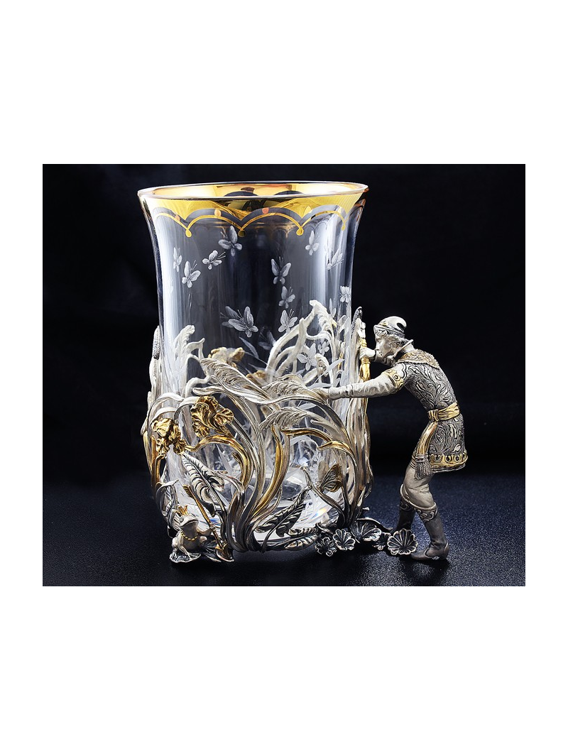 Серебряный подстаканник "Иван-царевич" с позолотой. Высота - 12.1 см., длина - 10.3 см., ширина - 7.7 см. Артикул: SPP0002