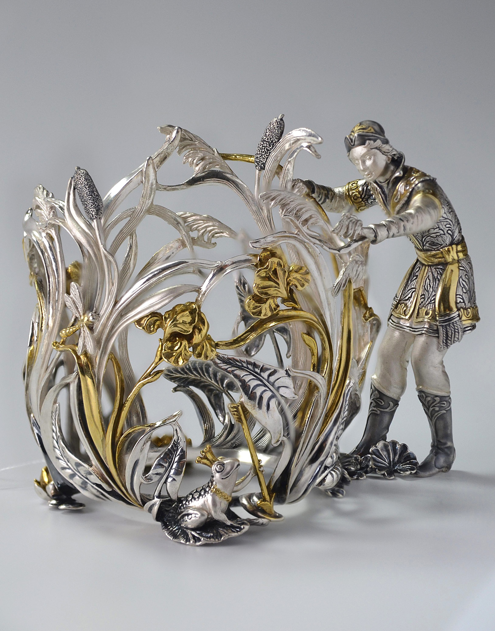 Представляем Вашему вниманию подстаканник «Иван-Царевич» из чайной коллекции «Царевна-лягушка». Уникальное сочетание глубины сюжета, отточенности линий и оригинального воплощения помогают зрителю буквально погрузиться в сказку. Интересной особенностью этого изделия является использование фигуры основного героя в качестве ручки подстаканника.