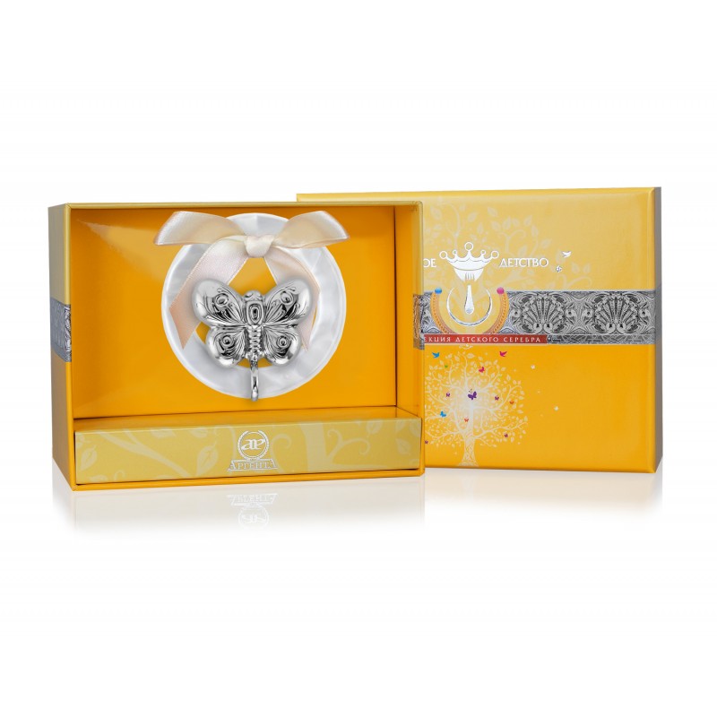 Детская серебряная погремушка «Бабочка на кольце»
