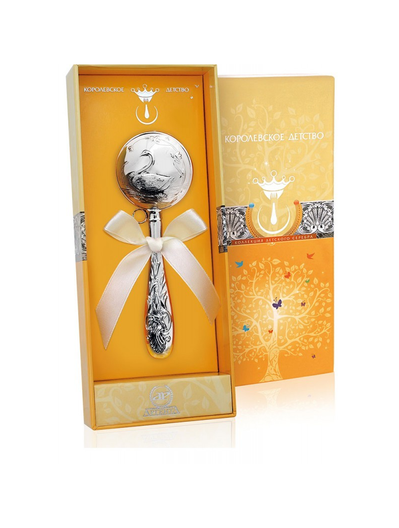 Серебряная погремушка "Лебедь" украшена фигуркой изящной птицы - символом любви, а рукоятка изделия декорирована растительными узорами, что придает особенно изысканный вид. Материалом погремушки послужило высококачественное серебро пробы 925. Благодаря нейтральному рисунку, погремушка подойдёт и мальчику, и девочке. Игрушка входит в коллекцию "Королевское детство" и упакована в жёлтый подарочный футляр. Изделие станет по-настоящему культовым подарком для ребенка.