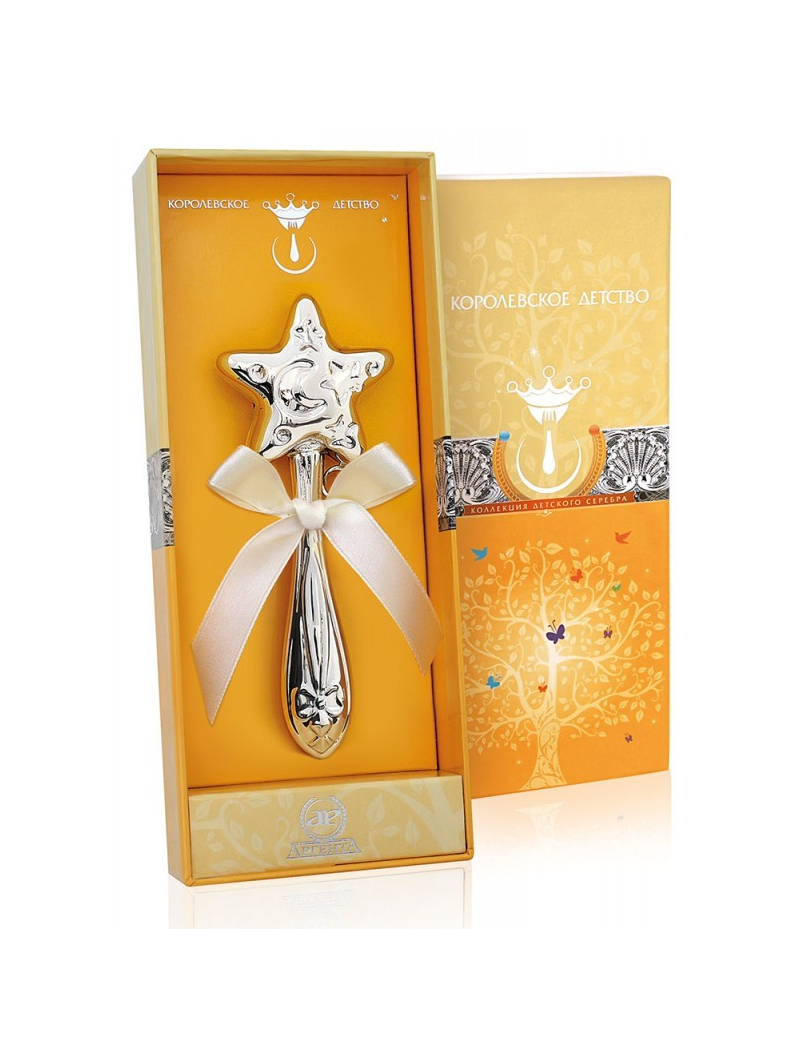 Серебряная погремушка "Звезда" удобно ложится в ручку малыша, который уже может удержать игрушку. Это изящное изделие может храниться в вашем семейном архиве и передаваться по наследству. Погремушка украшена фигуркой звезды, декорированной звездами и полумесяцем, такое украшение поможет ребенку сконцентрировать свое внимание и вызовет интерес. Изделие в жёлтый подарочный футляр "Королевской детство" с яркими сказочными рисунками. "Звезда" станет чудесным подарком для только родившегося малыша и принесет счастье в семью.