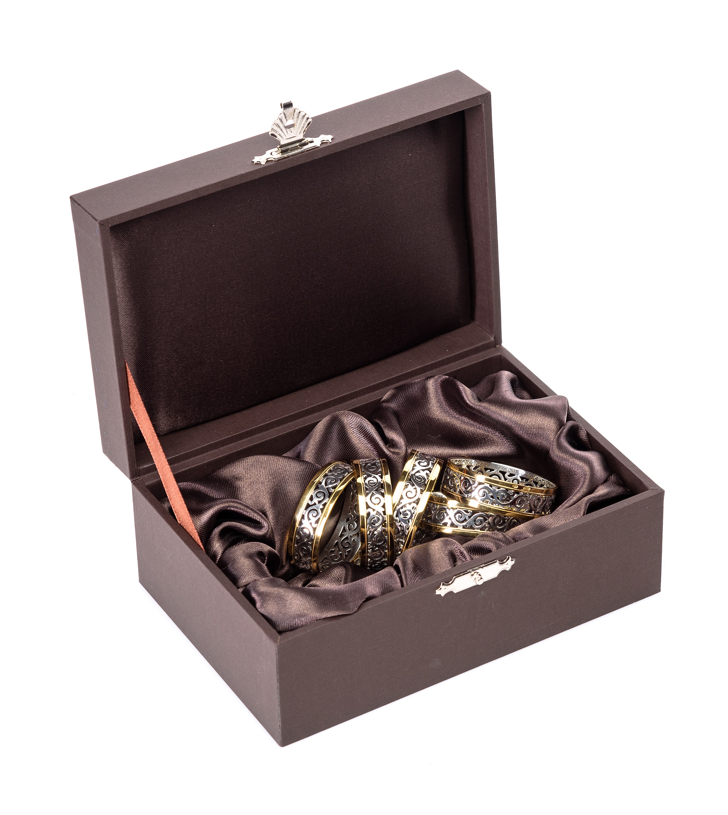Набор из четырех колец для салфеток из серебра с позолотой упакован в подарочный футляр.