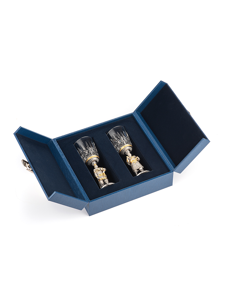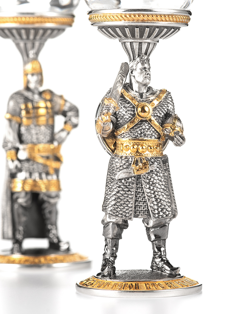 Набор позолоченных рюмок, объемом 25 мл., выполнен из серебра с хрусталем, полностью вручную. Питейное изделие «тет-а-тет» посвящено русскому воинству. В основании сосудов расположены пословицы. У витязя с мечом в ножнах — «Кто храбр, да стоек, тот десятерых стоит». «Тот герой, кто за Родину горой» — у богатыря с оружием на плече.