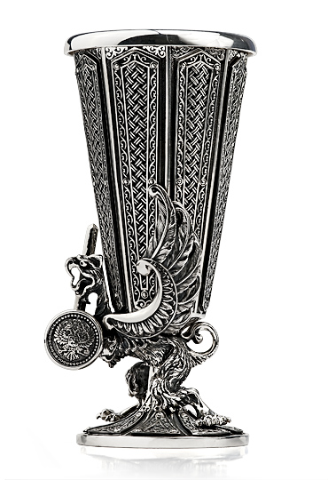 Водочная рюмка «Грифон» выполнена из серебра в классическом стиле. Имеет форму восьмигранного конуса с небольшой фигурной ножкой на круглом основании. Применено оксидирование, что придает серебру особую выразительность и глубину. Грани рюмки украшены позолоченным плетеным орнаментом традиционным для новгородских работ XII века. В основании сосуда расположен грифон с золотыми крыльями, в мощных лапах сжимающий золотой меч и круглый щит с изображением герба. Грифон символизирует могущество, благородство и силу. Это мифическое существо с головой и крыльями орла, а телом льва, олицетворяет власть над небом и землей. По легенде, имеет особый дар обнаруживать сокровища, поэтому его гнездо всегда устлано золотом. В начале прошлого века многие банки включали изображение Грифона в свои товарные знаки.