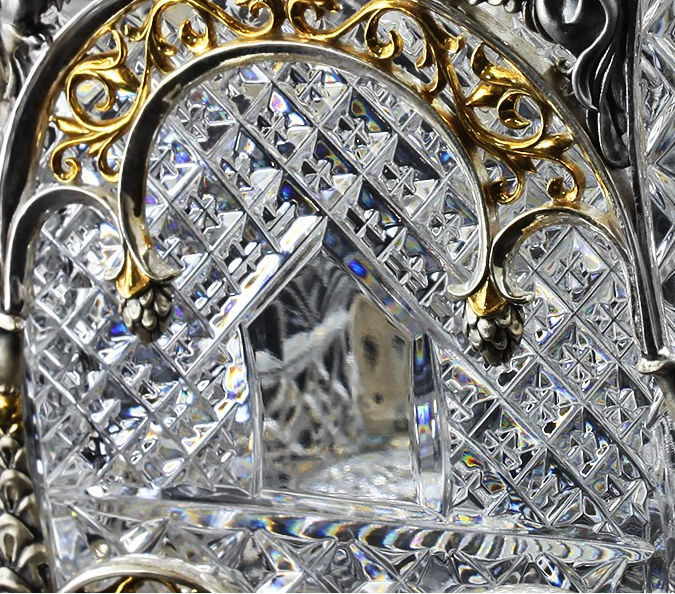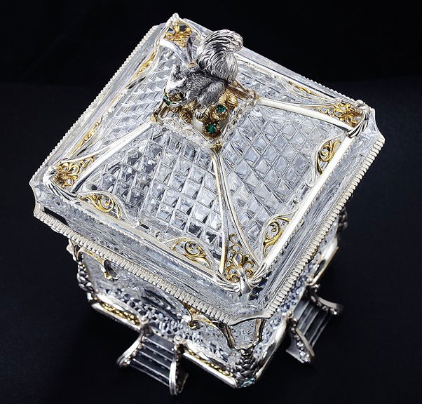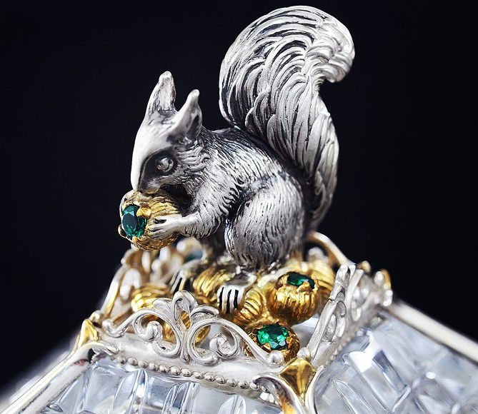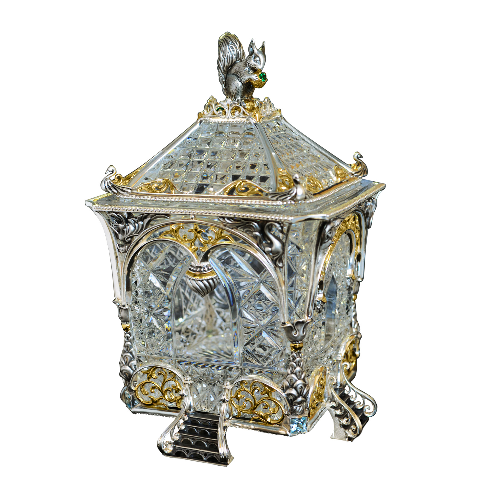 Сахарница «Белочка» из коллекции «По сказке о царе Салтане» выполнена из хрусталя и серебра 925 пробы Инкрустация 5 лабораторными изумрудами 0,75 карат. и 4 топазами 5,145 карат. Изделие изготовлено с применением технологий литья, золочения и оксидирования.