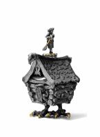 Серебряная солонка "Избушка на курьих ножках" – это художественно выполненная солонка с лопаткой для набора соли. Фигурки повторяют мотивы народных произведений. Под крышкой, выполненной в виде крыши избушки, располагается вставка для соли. Основанием композиции являются позолоченные ножки сказочного создания и баба яга, вылетающая из трубы. Подойдет в качестве подарка на особое, знаменательное событие. Станет отличным дополнением столовой коллекции. В 2008 году на майской выставке "Новый русский стиль", представленная коллекция получила сертификат, свидетельствующий о художественной ценности.