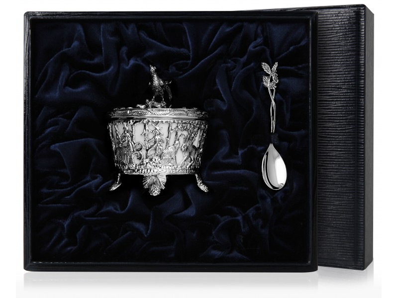 Серебряная солонка "Охотничья-Глухарь" с чернением. Высота - 7.5 см., ширина - 6 см. Артикул: SPC0011