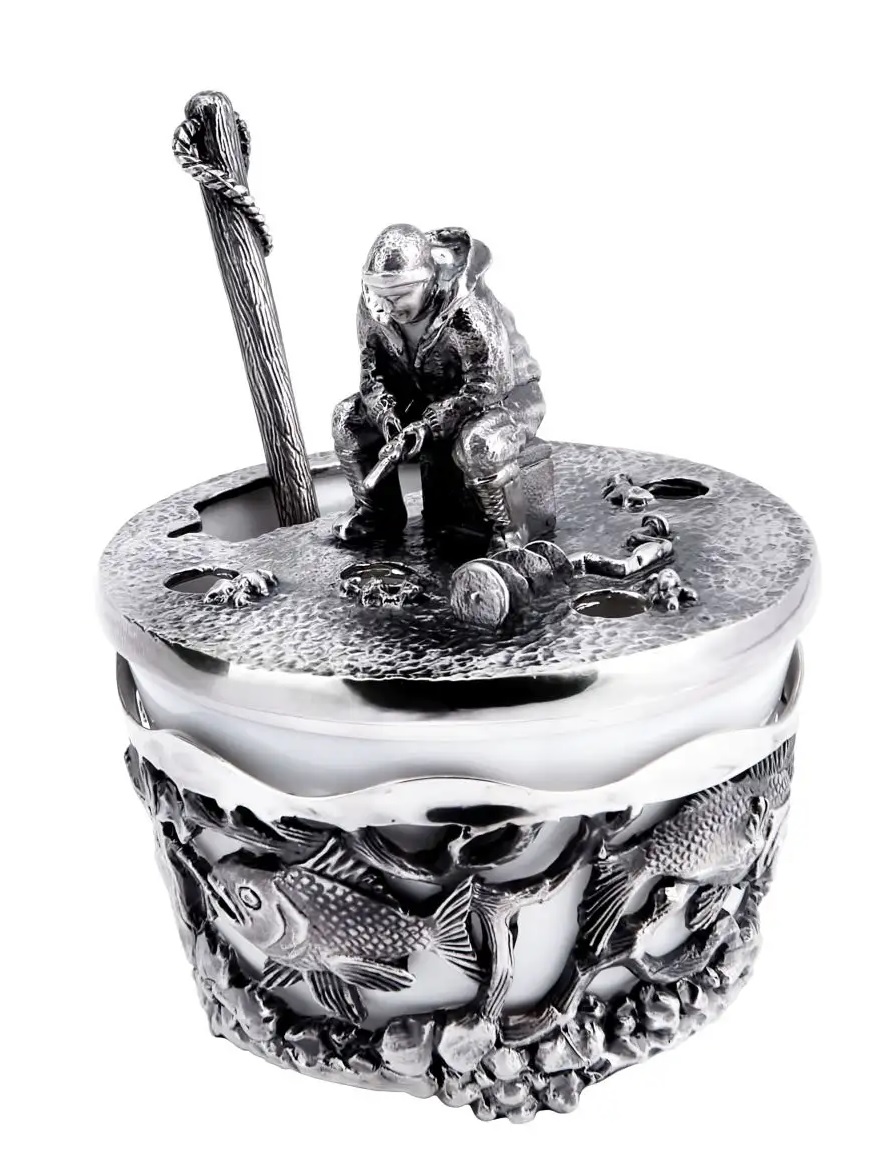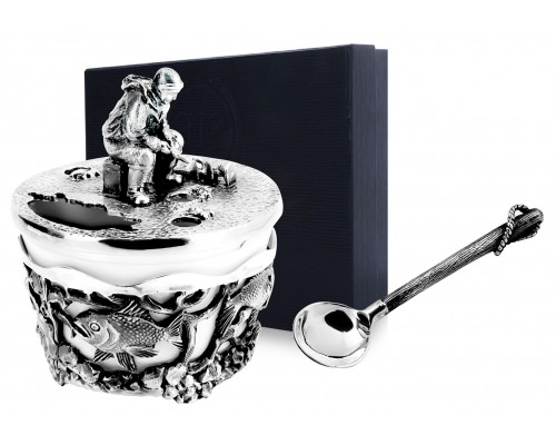 Серебряная солонка "Рыбак" с чернением с ложкой. Высота - 5 см., ширина - 5 см. (Длина ложки - 6.1 см., ширина - 1.1 см.) Артикул: SPC0008