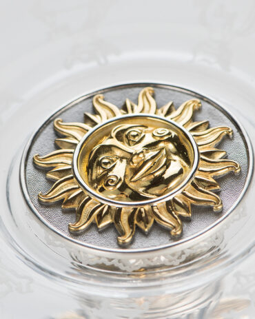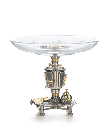 Серебряная ваза для сухарей выполнена из серебра со стеклом полностью вручную. Стержень блюда изготовлен в форме самовара. Образ взят из прейскуранта паровой самоварной и гармонной фабрики И.А. Козлова с сыновьями в Туле, и называется «самовар бокалом византийский гранный». Подставка сухарницы сделана в виде складного марокканского чайного столика. На подносе столика расположен заварочный чайник и изящная салфетка в стиле «trompe l’oeil». Закрутка блюда украшена улыбающимся солнышком, популярным образом из русских сказок. По кругу емкости выгравированы формы отечественных самоваров. Ножки вазы снабжены силиконовыми демпферами.