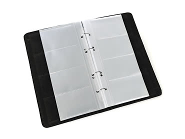 Прозрачные страницы с кармашками для визиток крепятся на кольцах, их легко вынимать и переставлять.