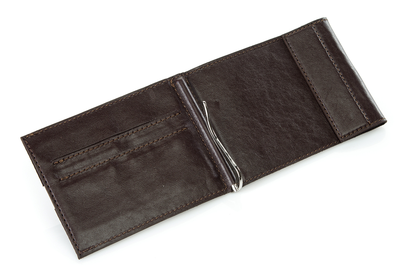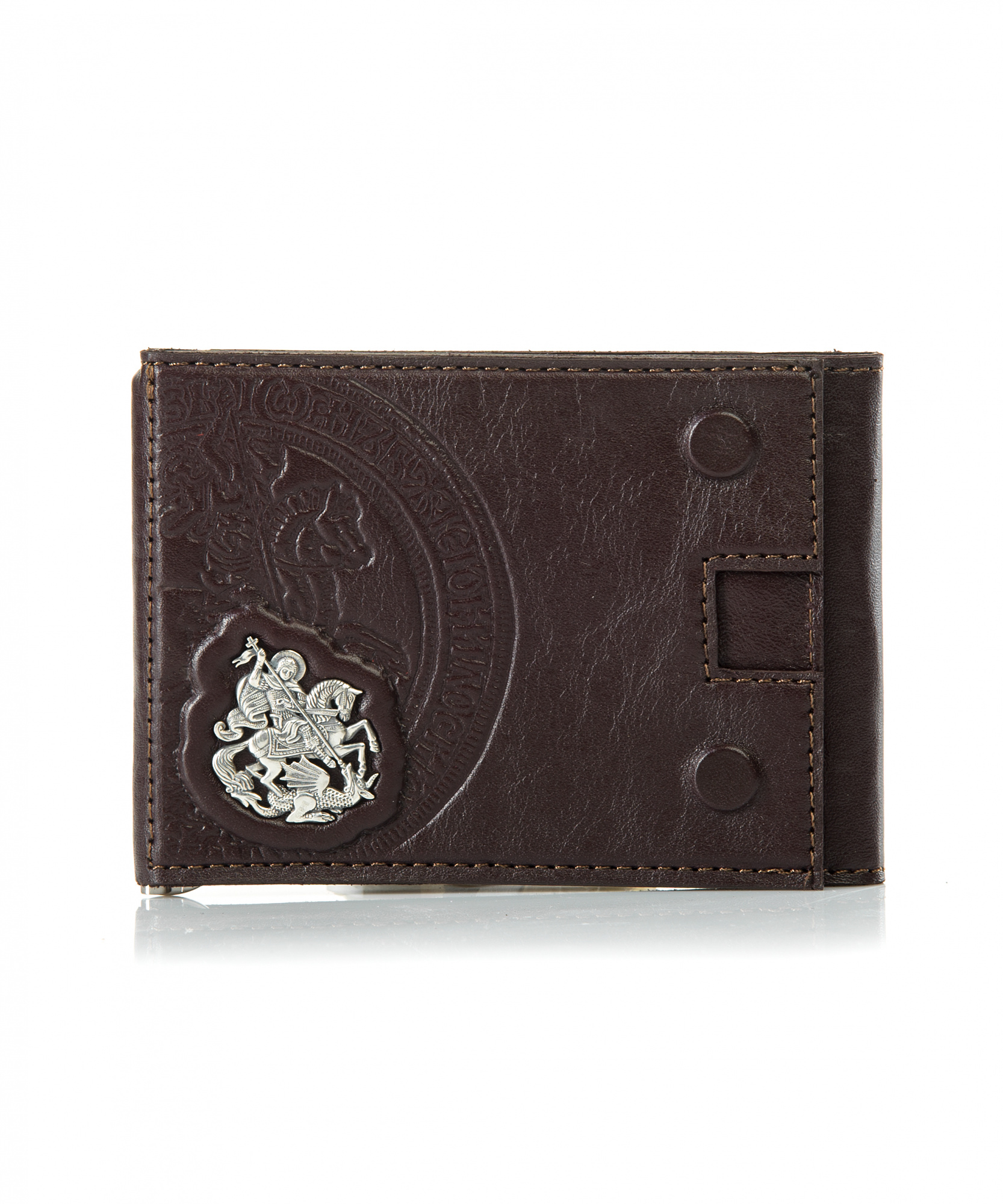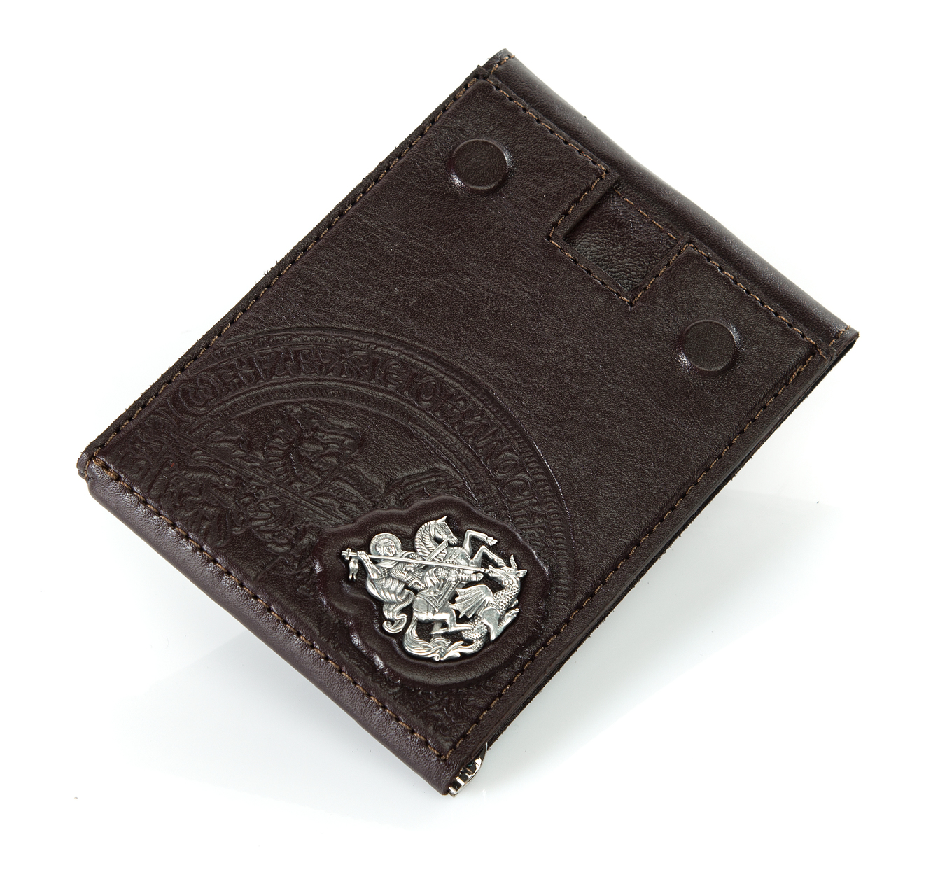 Зажим выполнен вручную из телячьей кожи и украшен серебряной плакеткой.